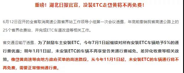 明年1月1日起,未安裝ETC的車(chē)輛不再享受各類(lèi)通行費減免、差異化收費等相關(guān)政策。