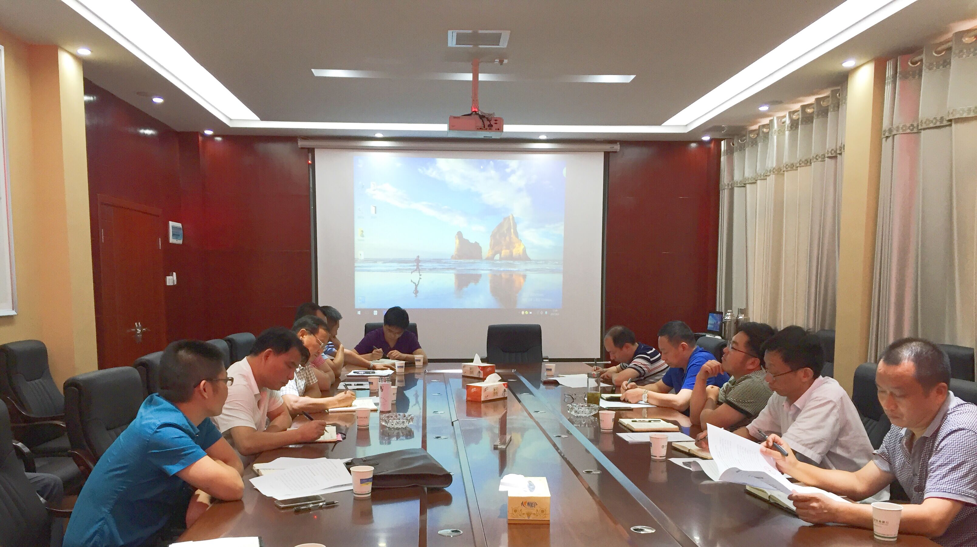 梅局長(cháng)一行首先觀(guān)看了非遺小鎮的宣傳短片,看完短片后梅局長(cháng)表示:非遺小鎮項目規劃設計宏偉,讓人震撼,同時(shí)又具有豐富的文化內涵,讓人期待。小鎮公司副總高輝具體介紹了項目整體概況和前期的進(jìn)展情況,并提出了項目落地建設的瓶頸問(wèn)題。國土局規劃科、用地科負責人對目前城市規劃的編制工作、用地政策及提出的節點(diǎn)問(wèn)題予以了說(shuō)明和解答。區文旅投董事長(cháng)胡述翔對梅局長(cháng)一行的到來(lái)表示了感謝并希望國土局大力支持非遺小鎮項目,爭取我區重大項目早日落地建設。梅局長(cháng)表示區國土局會(huì )迅速將項目區的土地“兩規”進(jìn)行編制并上報,同時(shí)還對國土局工作人員提出了“三多”要求,即:多服務(wù),多交流、多走動(dòng),以加速推進(jìn)項目建設,確保非遺小鎮項目一期工程如期開(kāi)工。